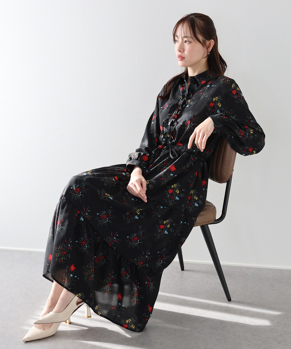 クラシカルな花柄が目を惹く、襟付きティアードワンピース