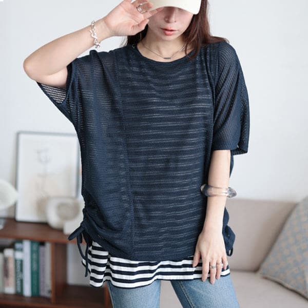 単品使いもできて着まわし力抜群☆透かし編みドルマンニット&ボーダータンクトップ2点セットの登場です!ゆとりのあるラフなサイズ感がが体型カバーとこなれを演出します♪裾サイドのドロスト×ドルマンシルエットが作り出す抑揚感のあるレイヤードスタイルをお楽しみいただけます。ドロストは好みのシルエットに調節ができるので、スカートにもパンツにも取り入れやすい着回し力抜群のセットアイテムです。