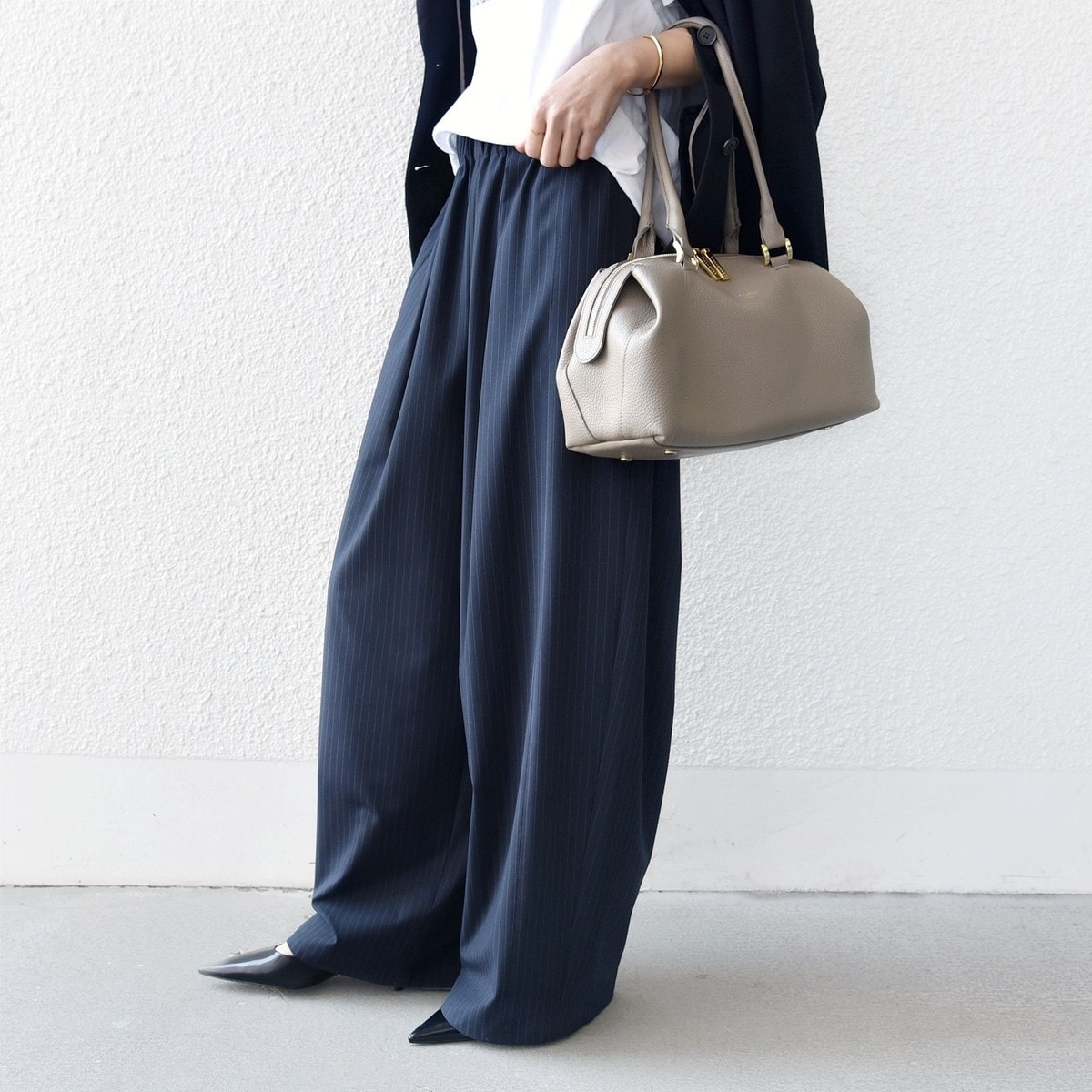 ハンサムなピンストライプは、きちんと感のあるシャツからカジュアルなスウェットまで幅広く相性◎