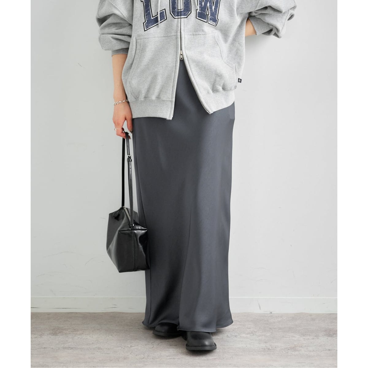 程よいツヤ感のサテン生地は落ち感があり、ニットやコートなどの重量アイテムに軽さをプラスできるため相性がよくオススメです!