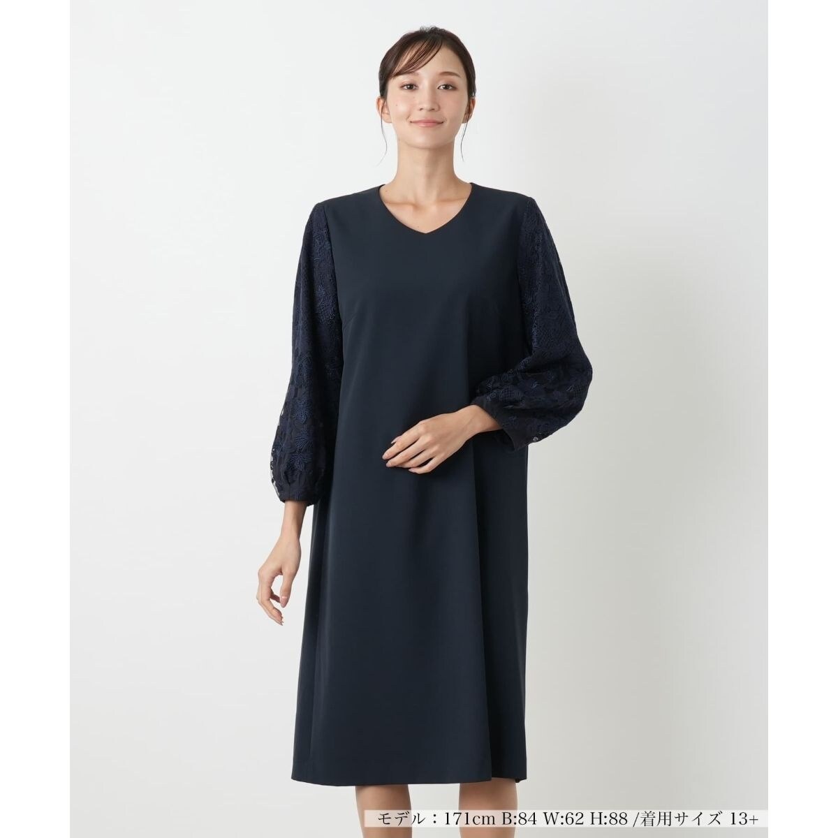 美しいレース使いが目を引く、上品な七分袖ワンピース。ポリエステルとポリウレタンをブレンドした本体は、程よいストレッチ性があり、快適な着心地を叶えます。デコルテや袖に繊細なレースがあしらわれ、大人の女性らしい華やかさを演出。Vネックデザインは首元をすっきりと見せ、洗練された印象を与えます。フォーマルなシーンから、大切な方とのお集まりまで、幅広い場面で活躍する汎用性の高い一枚です。特別な日のお出かけはもちろん、普段使いを格上げするアイテムとしてもおすすめです。