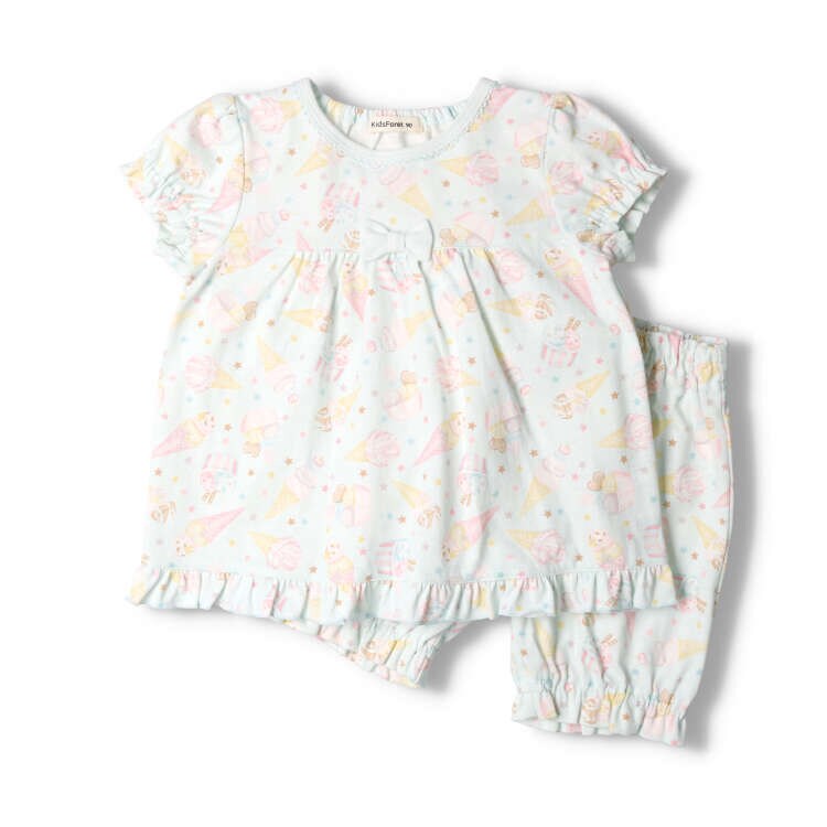 Tシャツ素材の半袖Tシャツとハーフパンツのパジャマ。本体は綿100なので、肌あたりが良くしっかり汗を吸います。夏らしいアイス柄!フレアに広がるシルエットがガーリーでキュートです♪【アイテム】トップス ボトムス カジュアル お洒落 オシャレ かっこいい かわいい 可愛い 普段着 デイリーウェア 半袖 トップス ハーフパンツ 短パン 半パン 半ズボン ボトムス 寝巻 ルームウェア 子ども こども 女児 女の子 ガールズ キッズ ベビーサイズ トドラーサイズ 幼稚園 保育園 小学校 小学生 2024年春夏物新作 丸高衣料 贈り物 ギフト プレゼント 帰省 お泊り会 旅行 ラベンダー 薄紫色 サックス 水色 キッズフォーレ