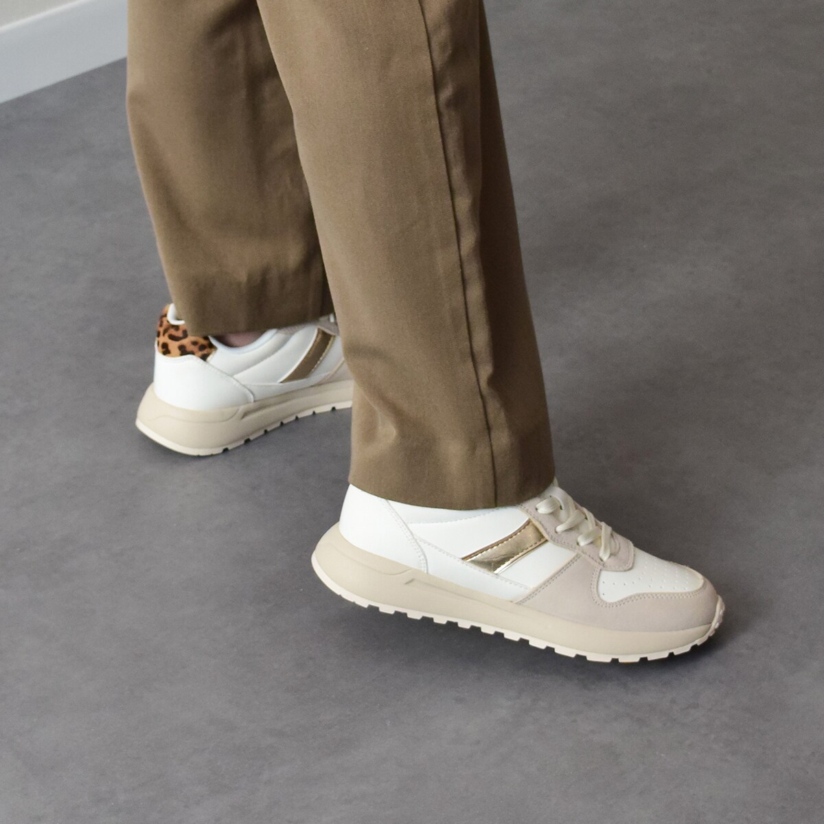 上質なスエードとスムース合成皮革を組み合わせたアッパーに、メタリックラインとヒール部のアニマル柄をアクセントとして配置。ベーシックなカラー構成にひとさじの個性を加え、都会的でありながらナチュラルな印象を演出します。アッパーに撥水加工を施しており軽い雨や汚れにも強い仕様になっています。
