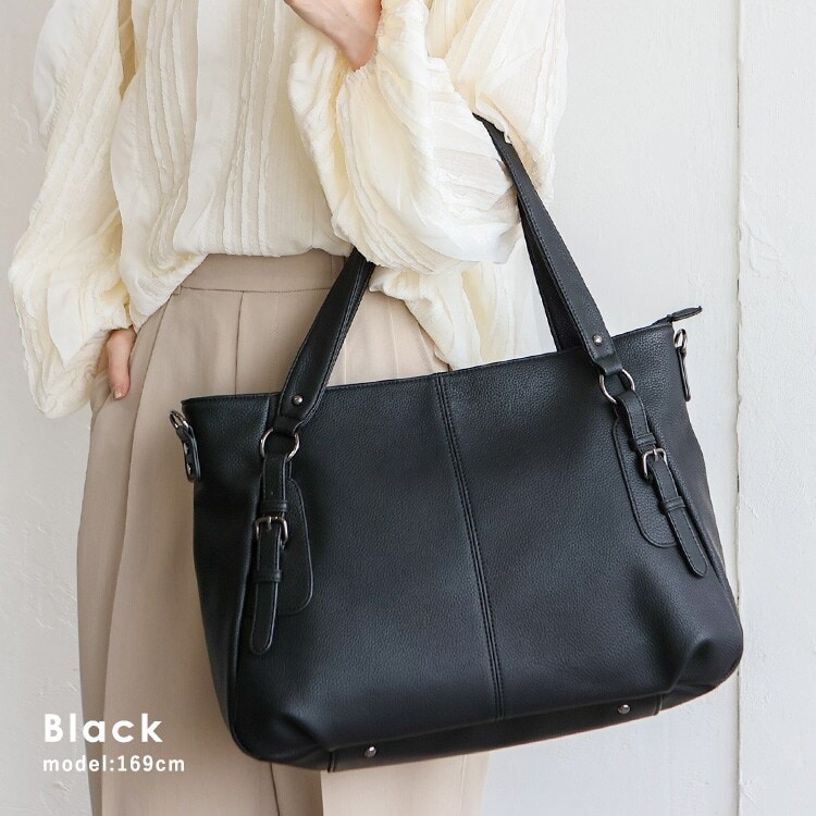 aroco 牛革 2way ブラックトートバッグ ショルダーストラップ付き