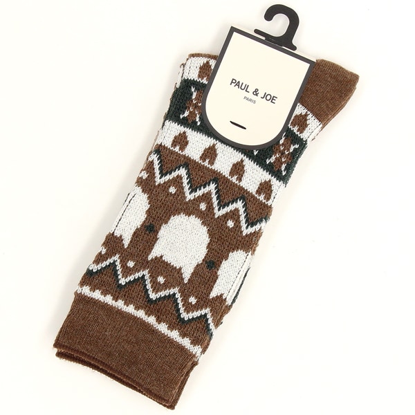 猫のシルエットとフェアアイルモチーフを組み合わせたパターンが可愛いクルーソックス。