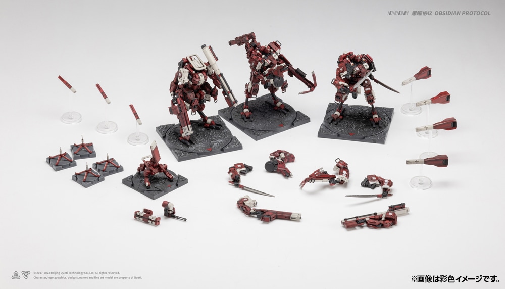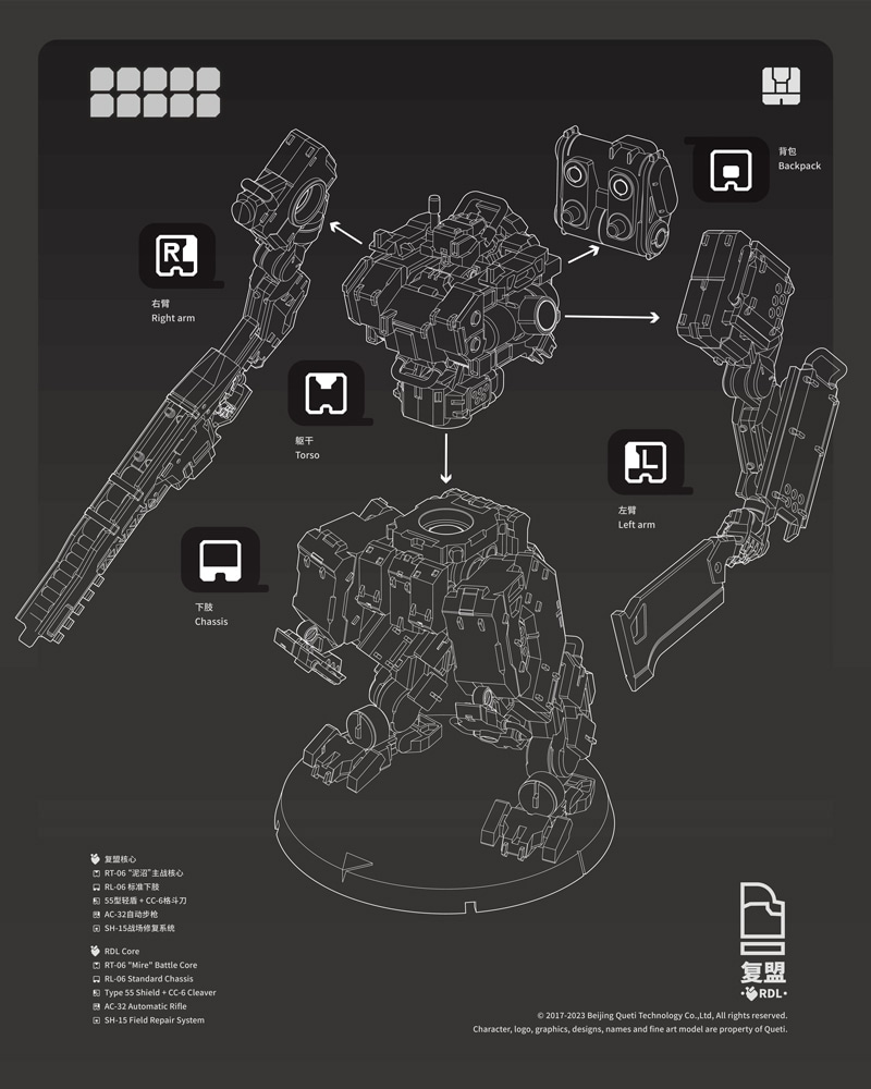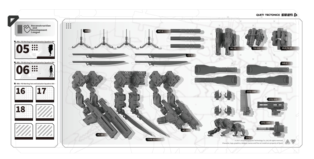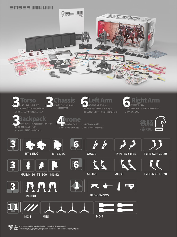『RDL鉄騎 拡張パック』では、軽量型M.A.P×3機と戦術ドローン×1機を組み立て可能。高速脚部ユニット、軽量火力モジュール、多機能武装パック、支援用バックパック、電子戦装備など、多数の交換式モジュールを搭載し、状況に応じた柔軟な編成が可能です。