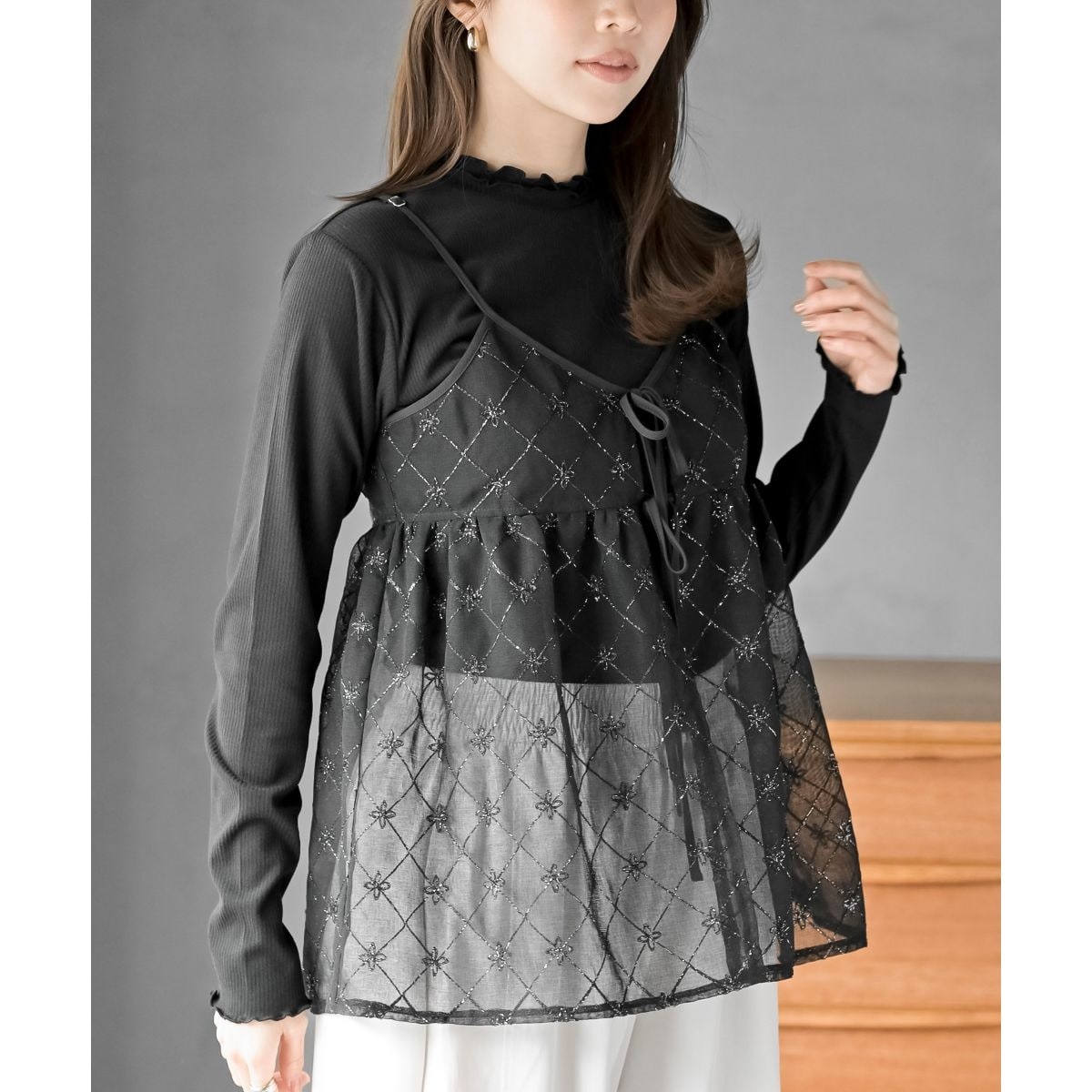 花柄刺繍前開きダブルリボンキャミソール