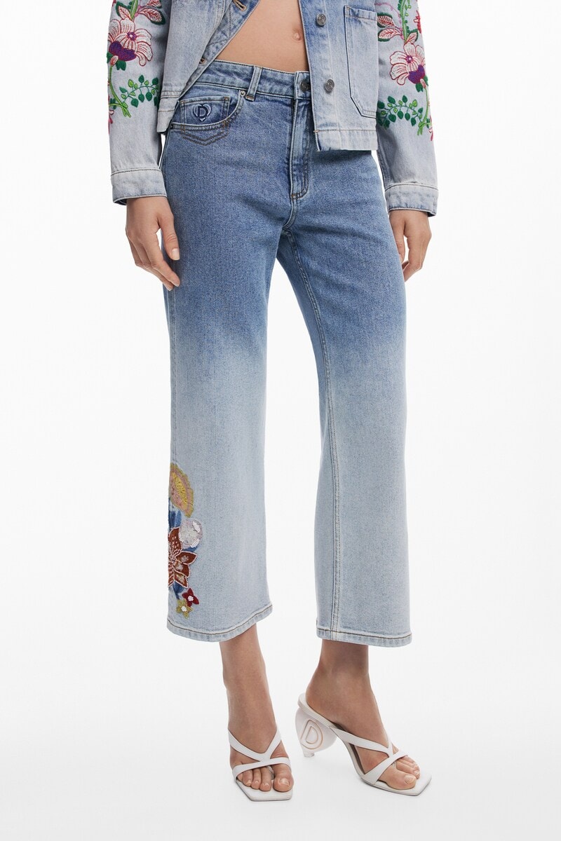 色のグラデーション効果、刺繍のディテール、裾のビーズ装飾が施された、キュロットカットのデニムパンツ。