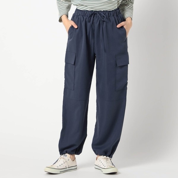 カジュアルアイテムであるカーゴパンツを光沢のあるエステルワッシャーで作る事で、カジュアルからベーシックまで幅広いコーディネートを可能にしています。