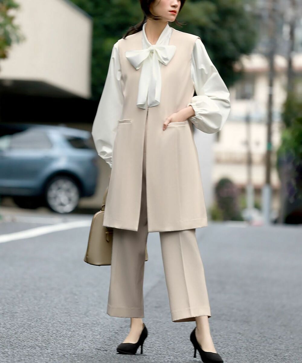 【3点セット】Vネックロングジレ・ボウタイブラウス・ストレートパンツ セット