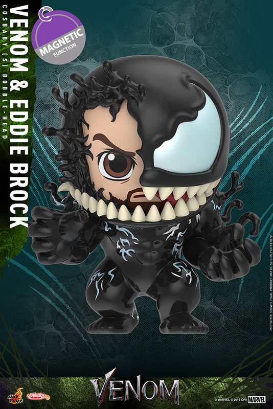 「コスプレさせられた赤ちゃん」をコンセプトとした「コスベイビー」シリーズより、『ヴェノム』に登場するヴェノム&エディ・ブロックを、全高約10センチのポップでカッコかわいいデフォルメフィギュアとして立体化。ヘッドはプルプル揺れる姿がユニークな、ボブルヘッド仕様。足の裏にマグネットが内蔵されているので、さまざまな場所にくっつけてディスプレーすることができるぞ!パッケージは、そのまま飾れるウィンドウボックスだ。