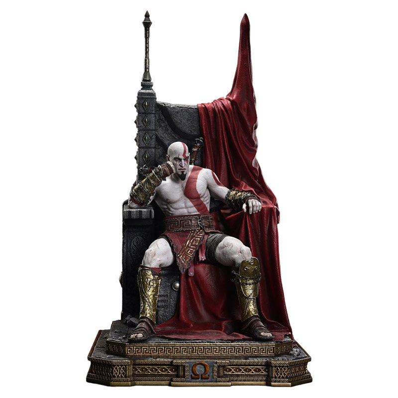 苛立ちをにじませる表情。深い喪失感が宿る白い肌。彫像のように隆起する筋肉。各部の造形と彩色は、戦士の姿を余すことなく伝える仕上がりです。金の篭手や脛当てにはダメージが施されており、腰布の擦れやほつれもリアルな出来栄え。背後に見えるブレイズ・オブ・カオスも、そのデザインを細部まで捉えました。身体を預けるのは古代ギリシャの巨大な玉座。優雅に垂れ下がる鮮やかな深紅も、忌まわしい記憶をよみがえらせます。