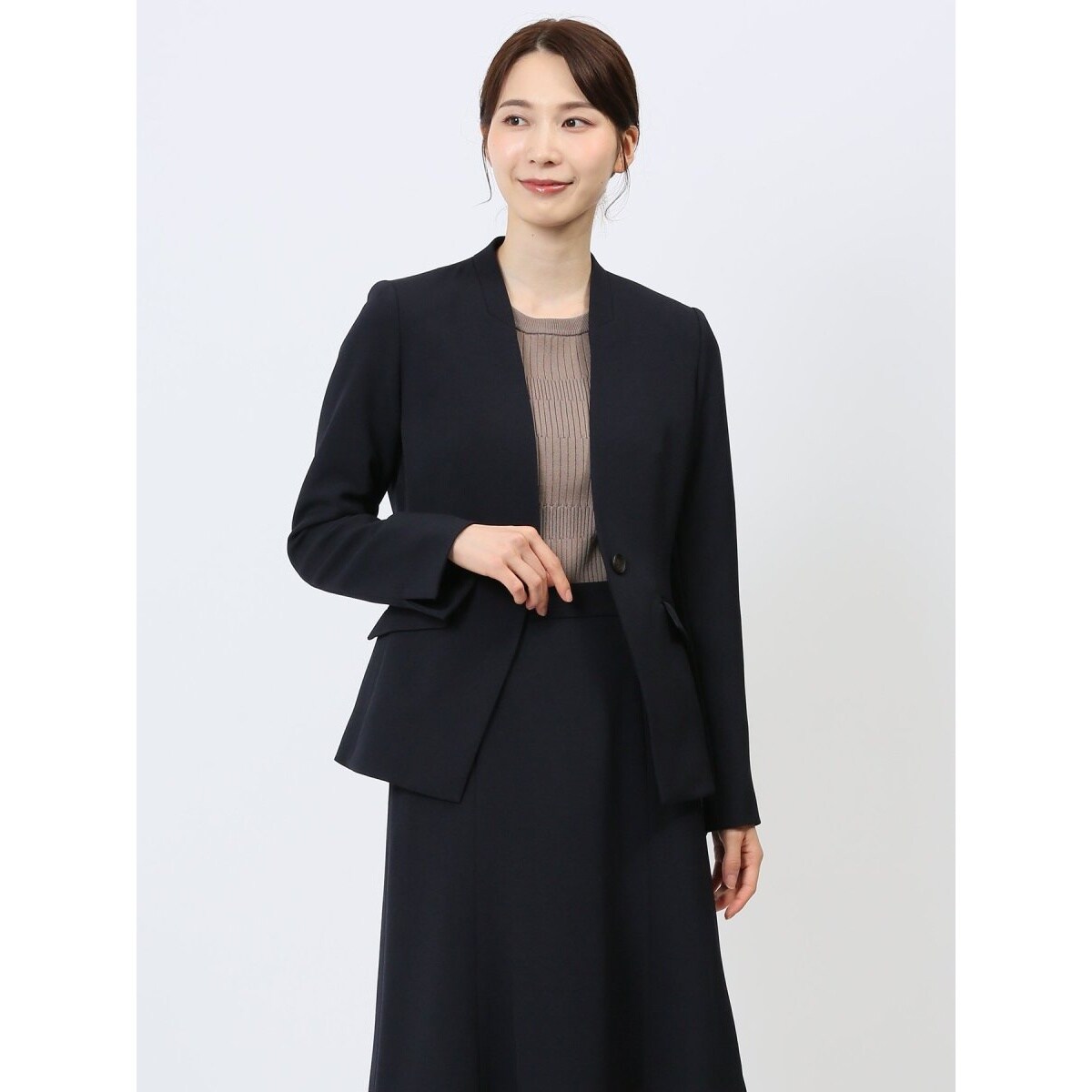 ストレッチウォッシャブル カラーレスジャケット 紺(セットアップ可能)