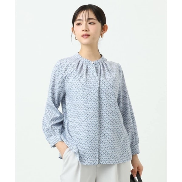 小さな幾何柄がオフィスシーンにもぴったりなブラウス。襟はネック程よく沿うバンドカラーで、アウターにも合わせやすいところがポイント。