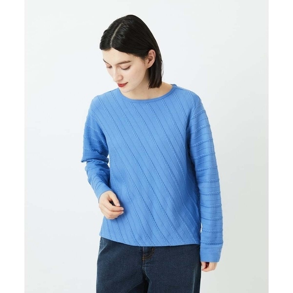 小さなケーブル風のタック編み柄がポイントの大人可愛いニットです。ピンタックとケーブル風タック柄をボーダーに編み込み、前身は編地をバイヤス使いに仕上げました。季節を先取りできる春らしいカラーの3色展開です。すっきりとした着丈でスタイルアップが叶い、ほどよくゆったりシルエットがこなれ感をプラスしてくれます。
