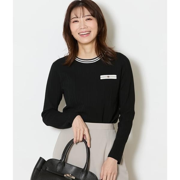配色使いにこだわったクルーネックデザインが、シンプルながらも洗練された印象に。襟ぐりと胸ポケット風デザインの配色にはラメ糸でラインを配し、アクセサリー要らずの華やかなアクセントに。リブ見えの編み組織で体のラインを拾いにくく、すっきりとしたシルエットを演出します。
