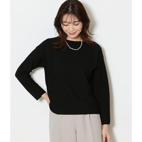 衿ぐりから肩にかけて施したワッフル調の編み柄が、さりげないアクセント。袖口や裾をリブで絞らないストンとしたシルエットで、体のラインを拾いにくく、すっきりとした印象に仕上げています。