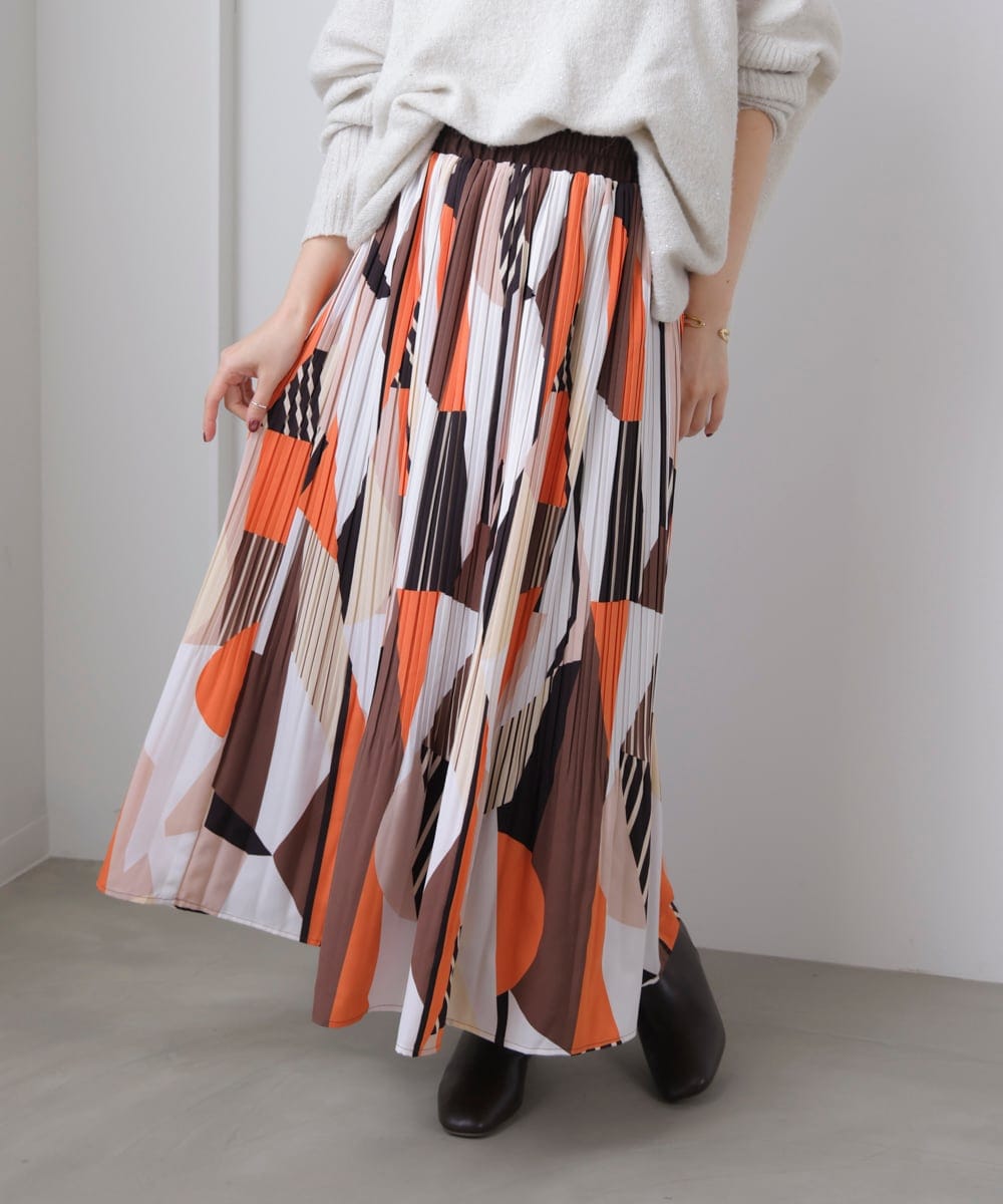 【942】アナイ キカプリントプリーツスカート オレンジトーン