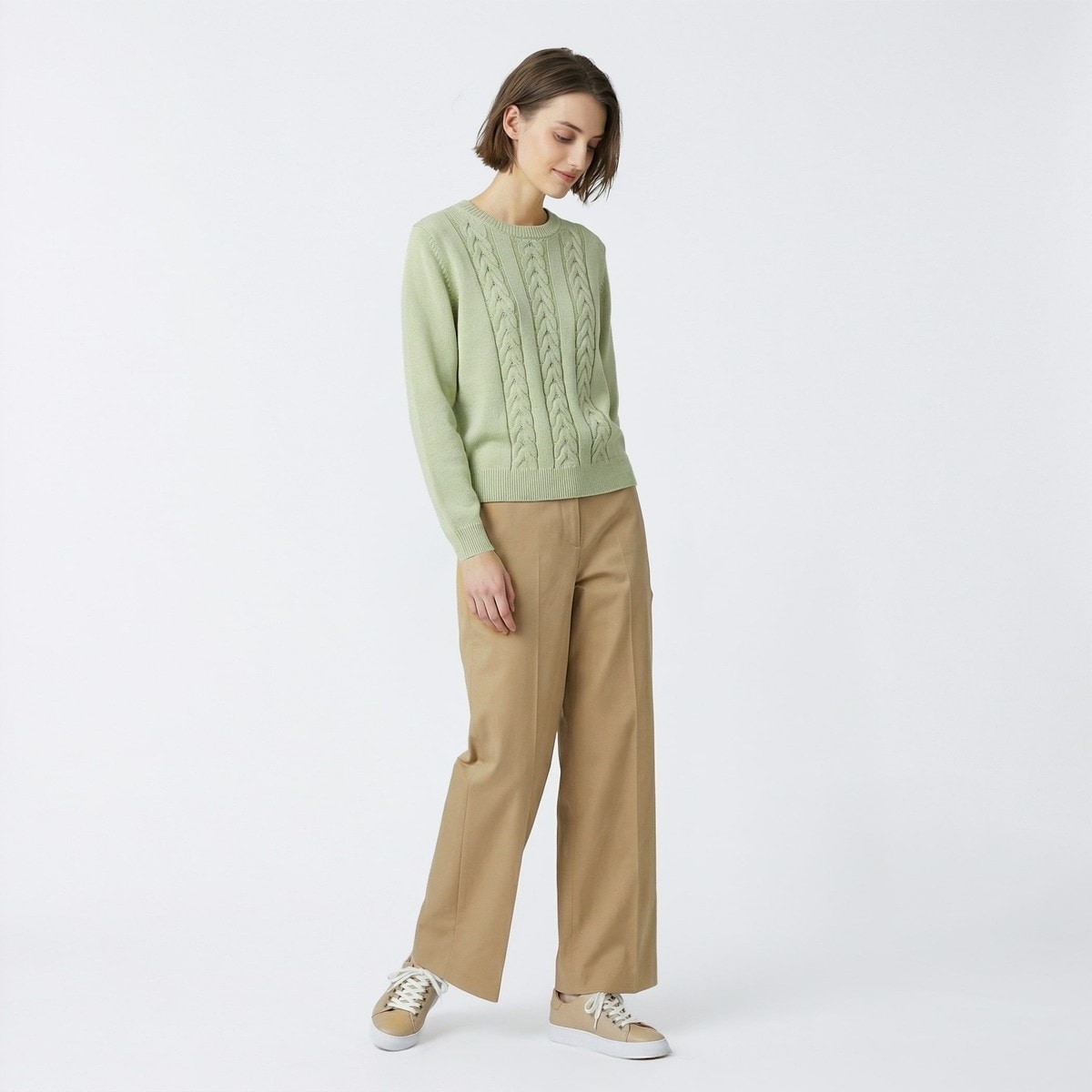 ベーシックなコットンチノパンツ。ややワイドなシルエットながら、センタープレスを施すことでレッグラインをすっきり見せてくれます。フラップ付きのヒップポケットなど、丁寧なつくりが品質の高さを物語る1本。合わせる着こなしを選ばない汎用性に優れたパンツは、ワードローブに必ず用意しておきたいアイテムです。