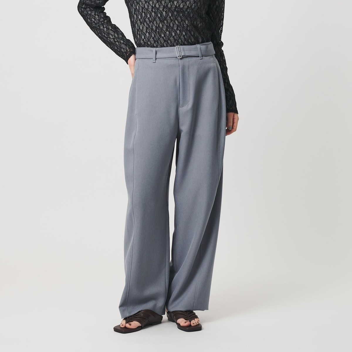 華奢なバックル使いのベルト付きカーブパンツ。