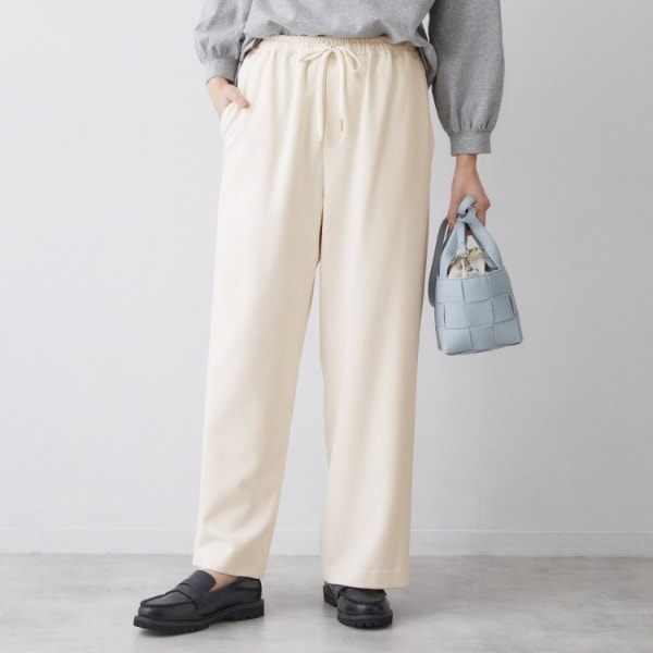 ウエストは総ゴム+ドローストリング仕様で、見た目はきれいめながらリラックスした穿き心地を実現。