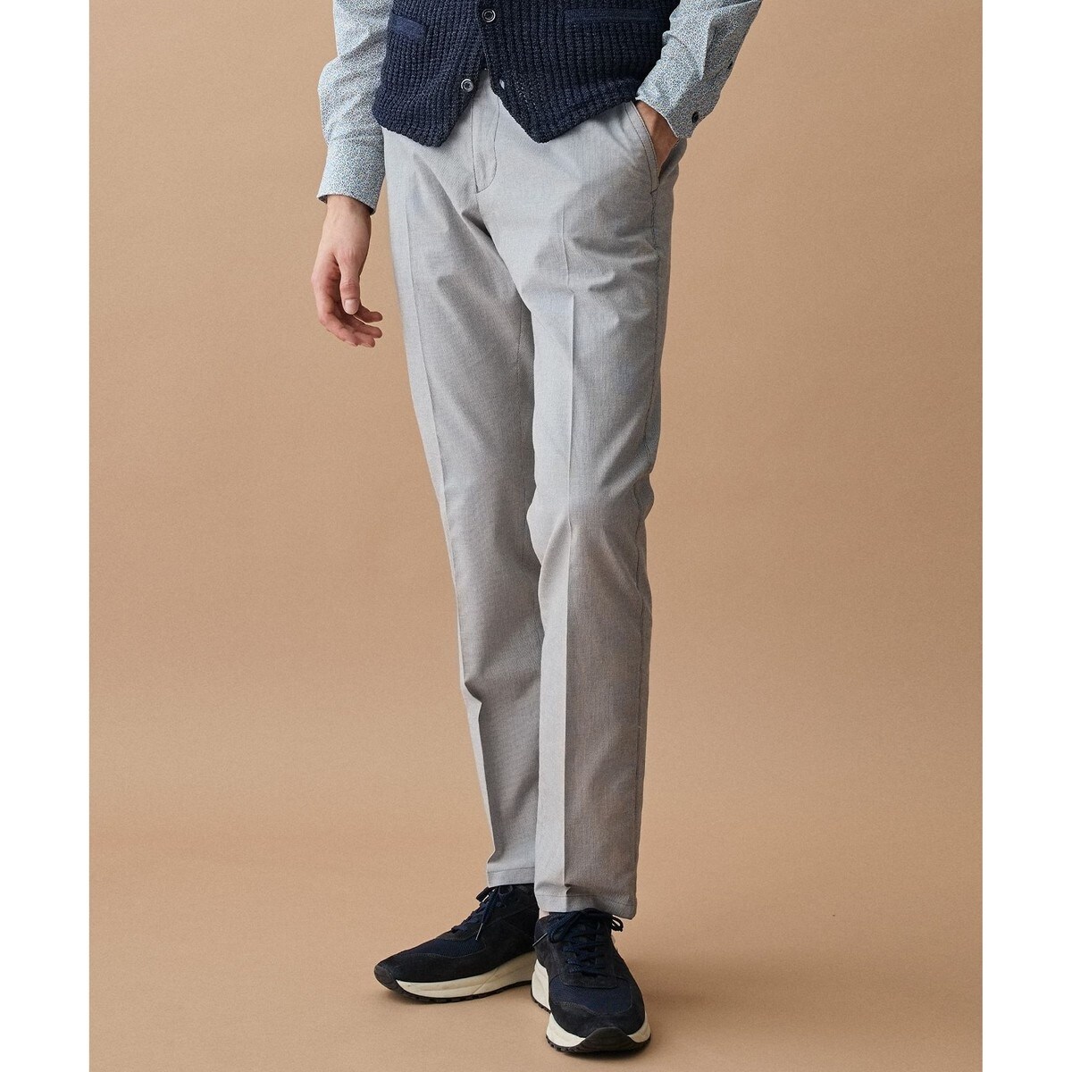 ジャケットを合わせたビジネスカジュアルスタイルから、休日のリラックスしたコーディネートまで幅広く対応します。一本持っていると様々なシーンで活躍する、着回しのきくパンツです。