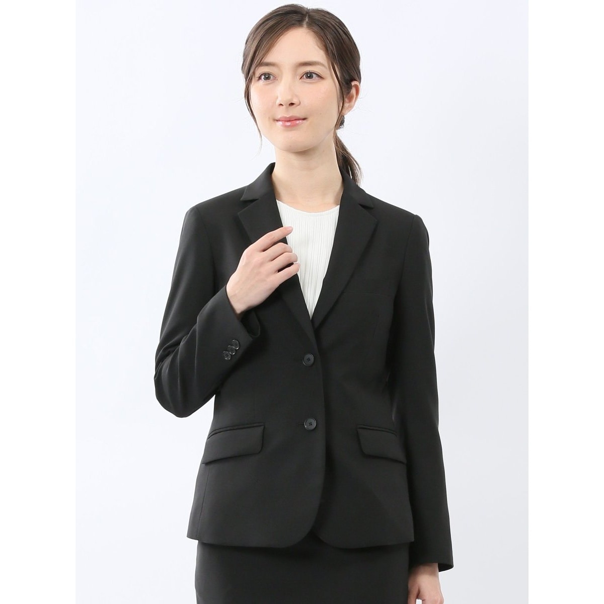 幅広い年代の方に着ていただける、シンプルな黒無地の二つボタンジャケットです。やや長めの着丈でベーシックなデザイン。胸ポケット・フラップポケット・内ポケット付きで利便性にも優れています。
