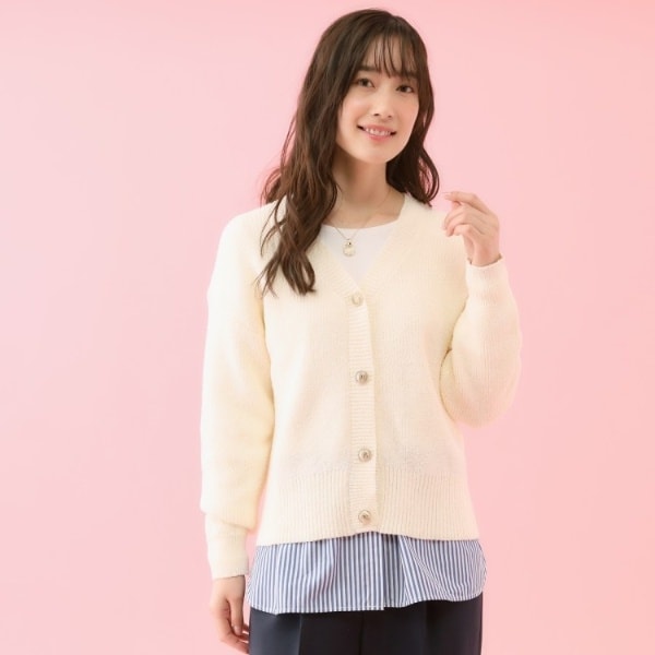 フィリーチョコレートとのコラボレーションで仕上げた、Vネックデザインのブークレニットカーディガンです。