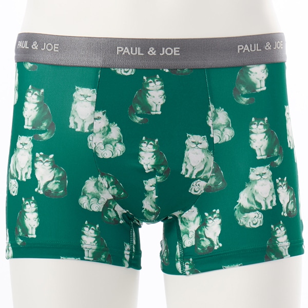 お座りネコ柄のボクサーパンツ。スタイルのフロントは丸みのある立体的なパターンで圧迫感を軽減した前閉じボクサーパンツ。素材は吸水速乾性のあるポリエステルベア天竺素材でサラッと快適、前マチ裏には肌に優しい綿ベア素材を採用しています。ウエストゴムは肌触りの良い裏パイル仕様。