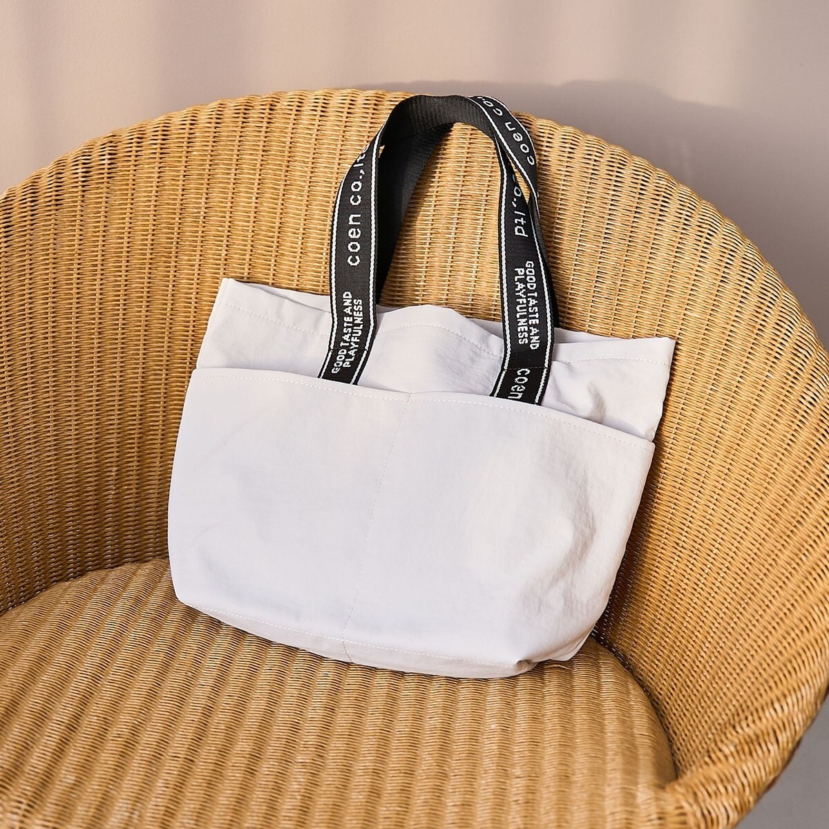 オリジナルのブランドロゴジャカードテープをポイント使いした、程よいサイズ感のトートバッグ。