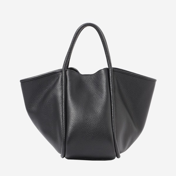 型押のシュリンクレザーのトートバッグです。適度な柔らかさがあり型押なので傷が目立ちにくいレザーです。内側のマグネットを留めれば奥行のあるフォルムの台形トートになります。またマグネットを外しサイドを正面としてショルダー紐を持てば薄いマチのショルダーバッグになります。ショルダー紐はギボシで長さ調節と取り外しが可能。内側は、ファスナーポケットがマチの中央にあり、3か所に物が入る仕様になっています。イタリアの工房で職人によって丁寧に仕上げられています。
