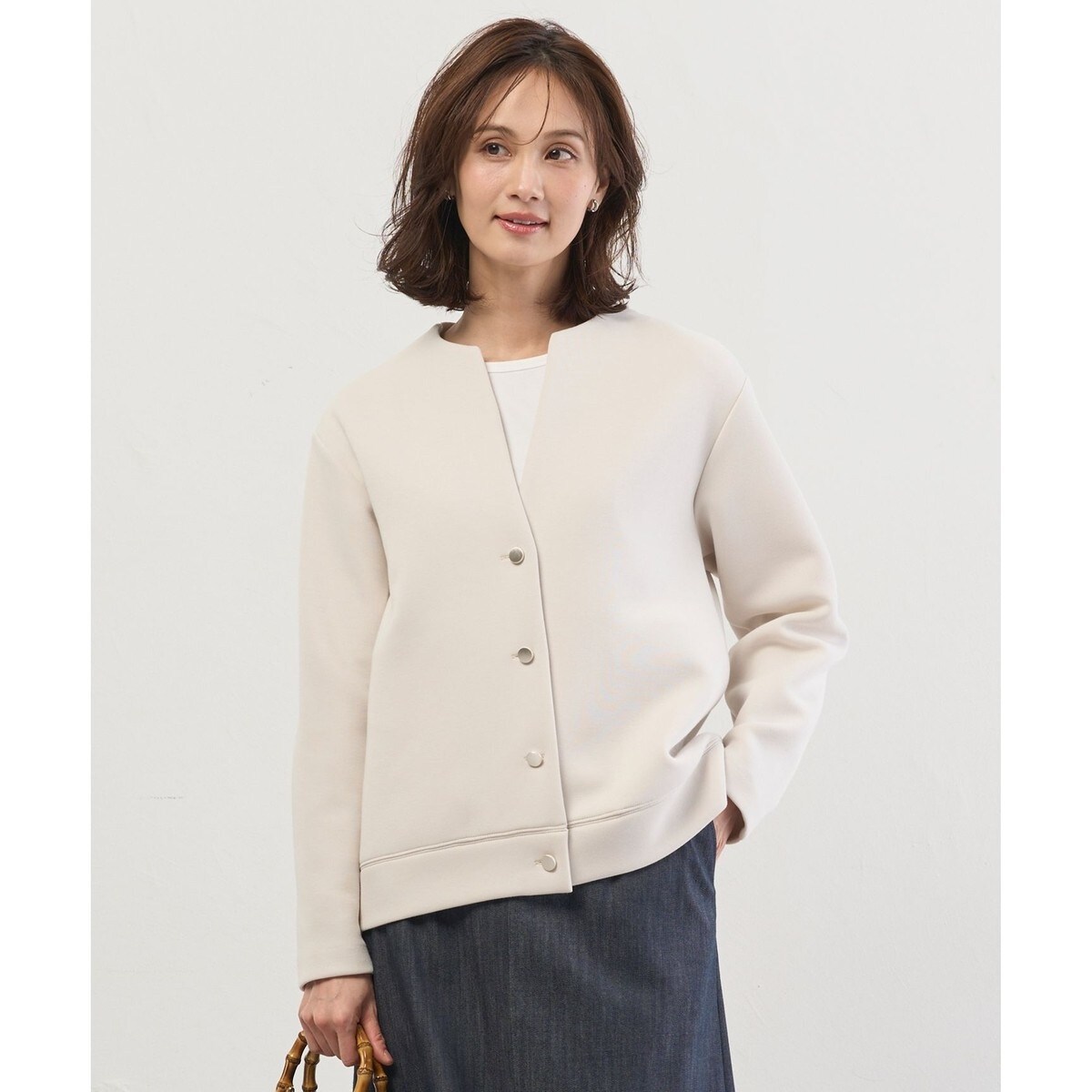 季節の変わり目に活躍する、さっと羽織りやすいブルゾン。気軽に羽織れ、カーディガンよりも価値感のあるデザインにこだわりました。前身頃はすっきりとシャープな印象でありながら、後ろの襟、裾、袖口にはニットリブを使用することで、快適な着心地とデザイン性のある1着に仕上げました。カラーは、ベーシックで合わせやすいライトグレー(#003)、女性らしいやわらかな印象のライトベージュ(#033)、リラックス感と落ち着きのあるネイビー(#075)の3色展開です。