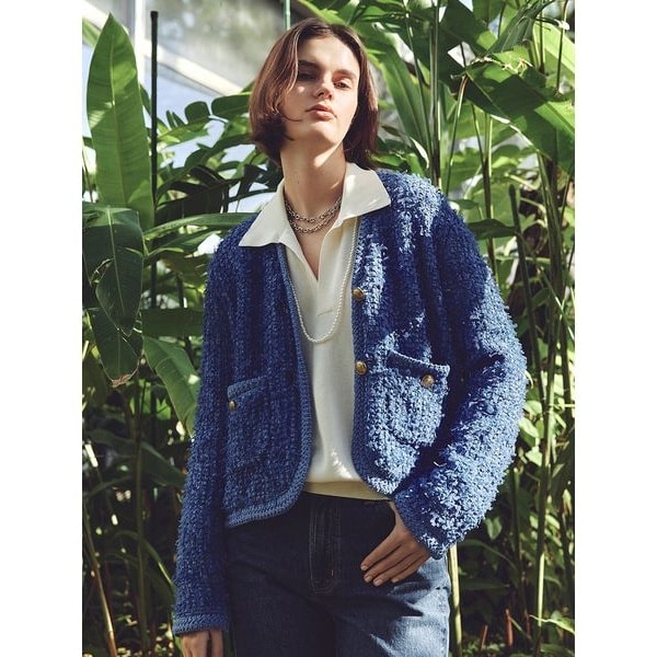 しっかりと肉感がある編み地で、ツイードのようなムードに仕上げています。前立てやポケット口、裾などは同系色のブレードでトリミングしています。