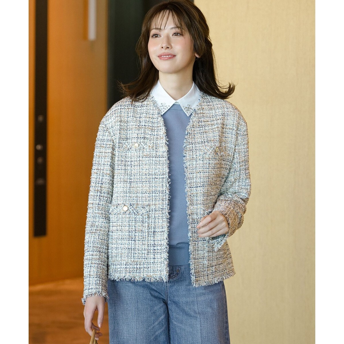 クルーネックとVネックの中間の襟ぐりを採用した、インナーを選ばないツイードジャケット。ボウタイブラウスやハイネックニットもきれいに決まる襟仕様にしています。着丈はスカートもパンツにも合わせやすい丈感です。縦に入れた切り替えが、綺麗にボディーラインに沿うフォルムをつくります。さりげないフリンジと華やかな金ボタンがアクセントにスタイリングを彩ります。コンパクトで軽くなめらかな着心地なので、長時間のオケージョンシーンにもおすすめです。デニム合わせでデイリーにも、落ち感のあるボトムを合わせてリュクスにまとめても素敵です。カラーは、柔らかな光を纏うアイボリーミックス(#302)、クラシックで深みのあるネイビーミックス(#375)、シックなコントラストのモノトーンミックス(#305)と、オケージョンシーンにも合わせやすい3色展開です。