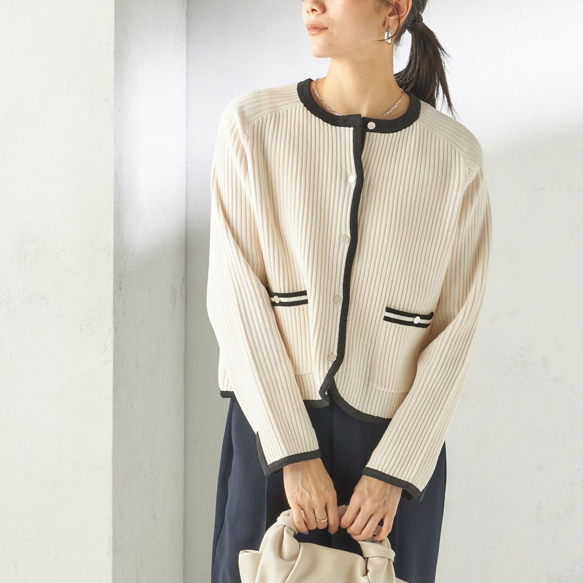 オンオフで主役になる配色ラインがワンポイントになったリブカーディガン