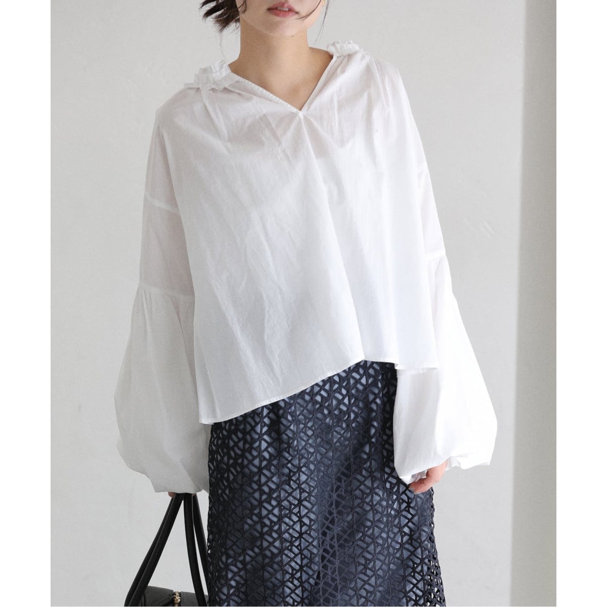 首元の繊細なフリルと、ふんわりとしたボリュームスリーブが女性らしいブラウス。