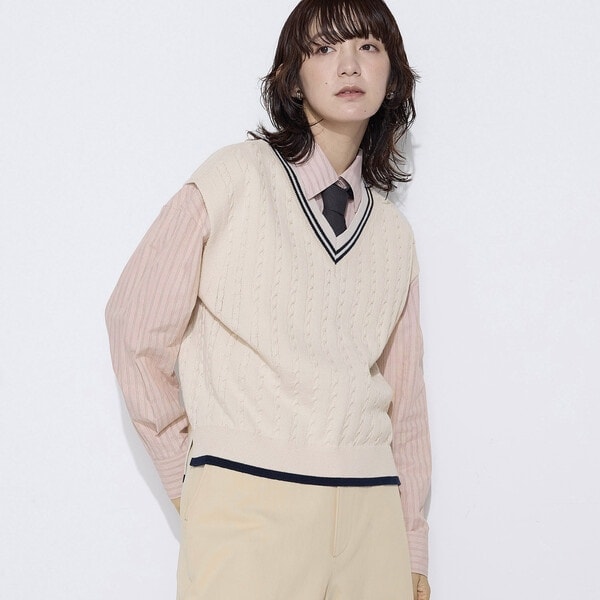 シャツとレイヤードがしやすいよう、袖ぐりやVネックあきをやや広めにしています。