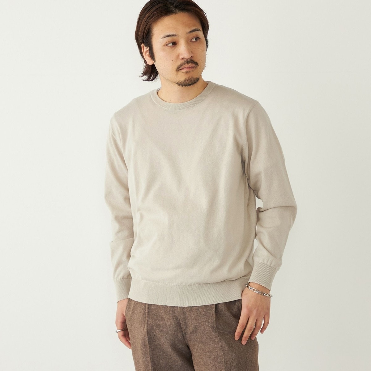 袖や裾にリブを配した、ベーシックなクルーネックニットです。