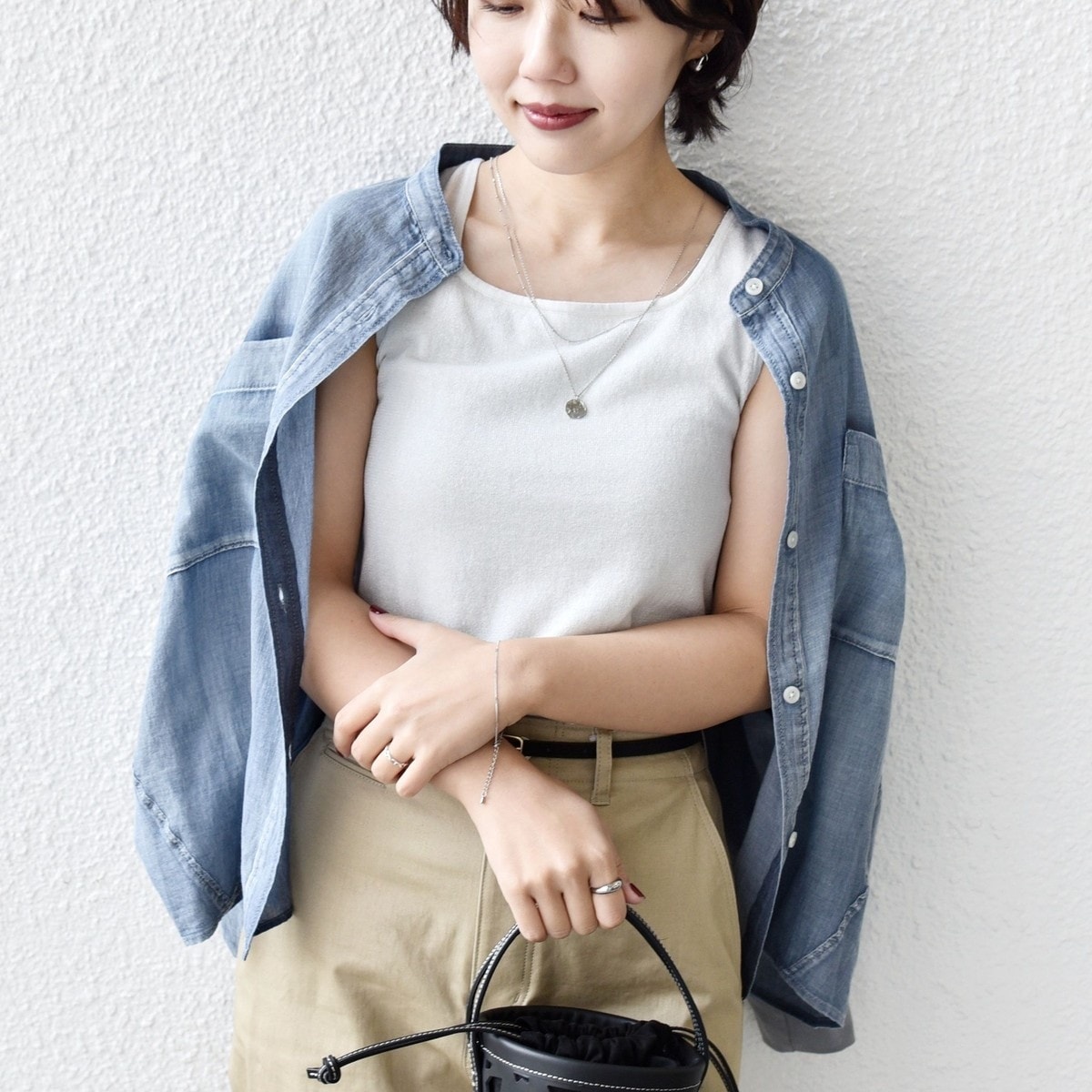 シャツやジャケットのインナーとしても合わせやすく、程よくヘルシーな肌見せを演出します。