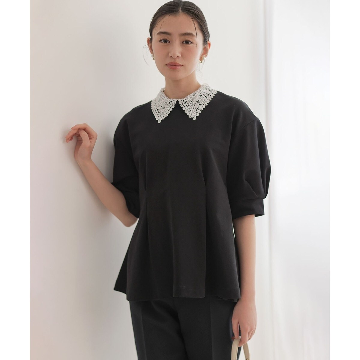 ■デザイン・レース襟を取り外すとシンプルなスタンドカラーになり幅広いシーンで着回し可能です。・身頃は裾に向かってゆったり広がるフレアシルエットで、前身ごろのタックが程よくウエスト周りをすっきり見せてくれます。・袖口はタックをあしらった7分袖のパフスリーブでよりフェミニンな雰囲気に仕上げてくれます。・後ろの襟ぐりはパール釦開きで着脱も簡単です。