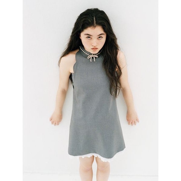 首元で揺れるリボンビジューが華やかなアクセントになるミニワンピース。見頃と同じ生地で施したスカラップをアメリカンスリーブデザインに落とし込み、上品で女性らしいムードを引き立てます。ほどよく体から離れるAラインシルエットが、スタイルを美しく見せてくれるのも魅力。裾はシフォンプリーツ素材と裏地をドッキングし、軽やかなレイヤード風デザインに仕上げました。1枚で主役になる特別感のあるアイテムです。