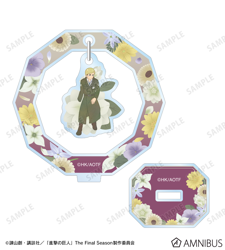 エルヴィンのイラストをボタニカルデザインに落とし込んで繊細なタッチで新たに描き起こし、ゆらゆら動くアクリルスタンドに仕上げました。