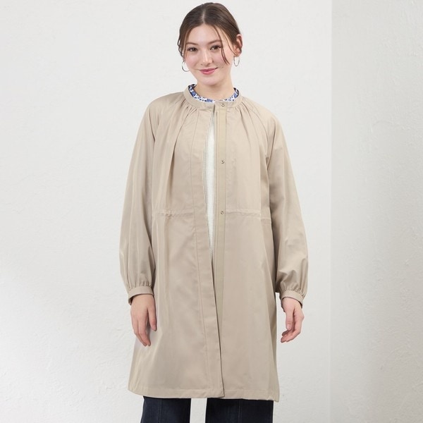 スタンドカラーにギャザーを施したスプリングコート。