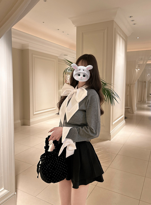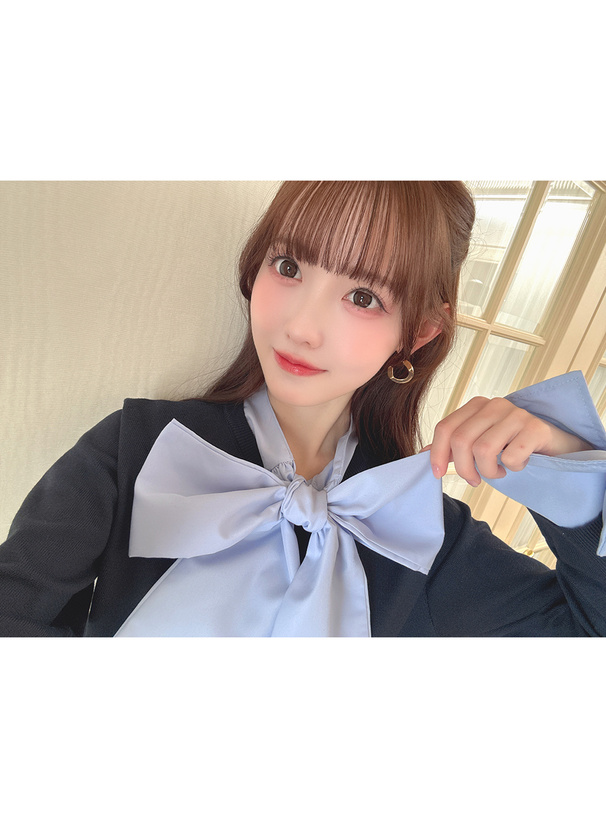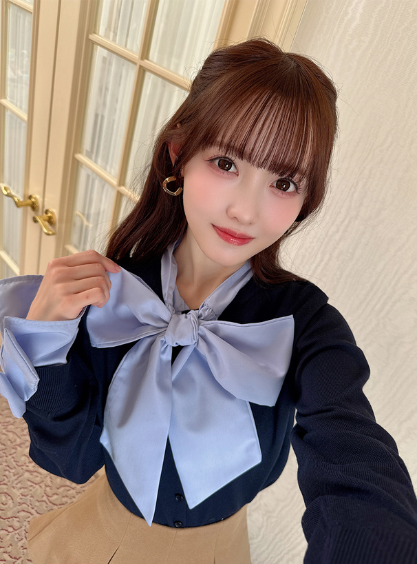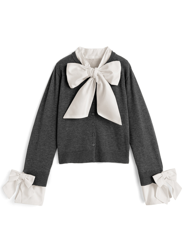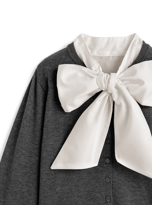 ボウタイブラウスとニットカーデを組み合わせたようなレイヤード風トップス。
