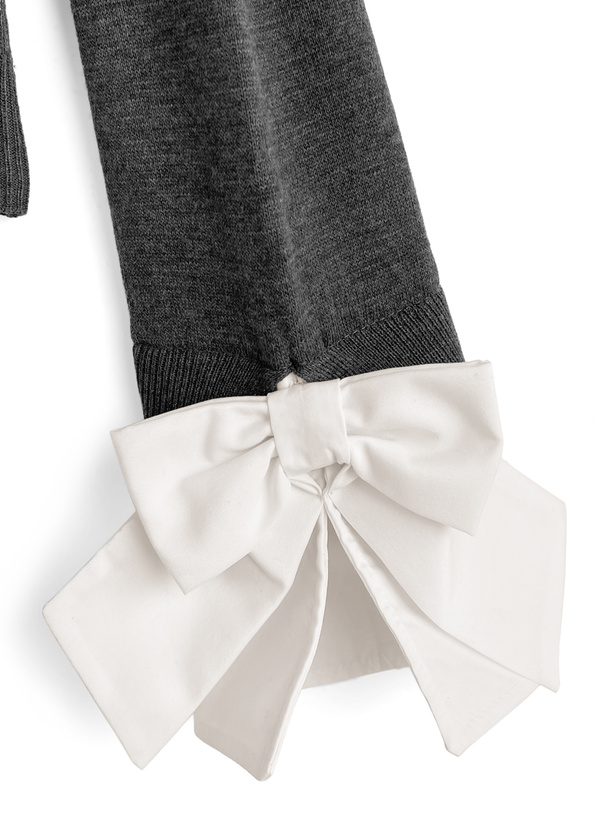 袖部分には立体的なリボンモチーフをあしらい、フェミニンムードたっぷりに仕上げた。