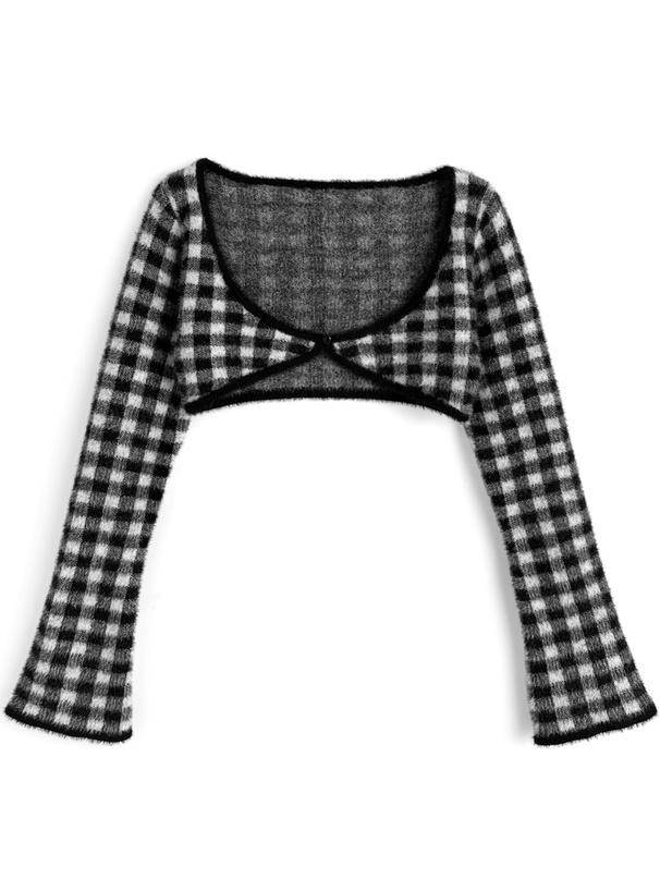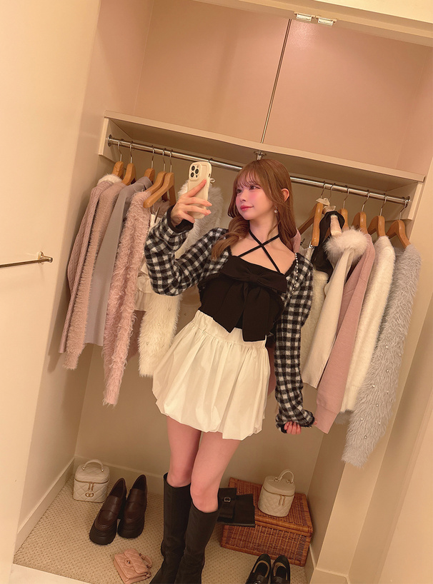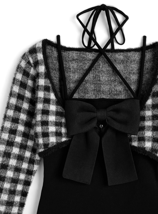 チェック柄のボレロとタイトなキャミソールがセットになったアンサンブル。