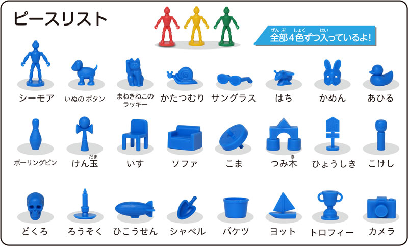 お題カードと同じピースを箱の中から見つけ出し、一番はやくピースを揃えた人が勝利します。