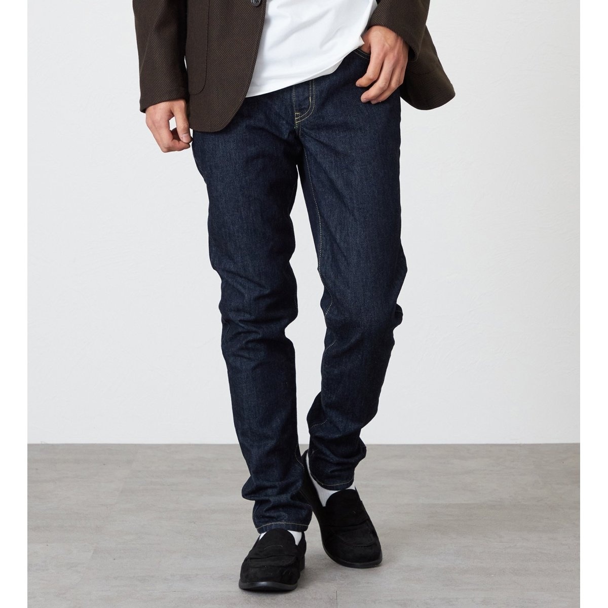 王道のテーパードシルエットは、トップスを選ばず幅広いスタイリングに馴染む万能さが魅力です。シンプルな着こなしでもシルエットの良さが際立つため、デイリーに使いやすく、季節を問わず活躍する一本です。