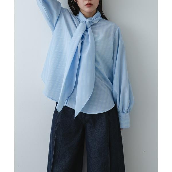 シワになりにくい軽量なシャツ素材を使用しているため、デスクワークや外出時でも型崩れを気にせず、常にクリーンな佇まいを保てます。最大の特徴であるボリューム感のあるボウタイは、身に纏うだけで立体的な美しさを生み出し、アクセサリー要らずで上品なコーディネートを完成させます。涼しげなサックスブルーのストライプ柄が、甘くなりすぎない爽やかな印象を与えてくれるため、オフィスシーンから休日のお出かけまで幅広く活躍する一着です。