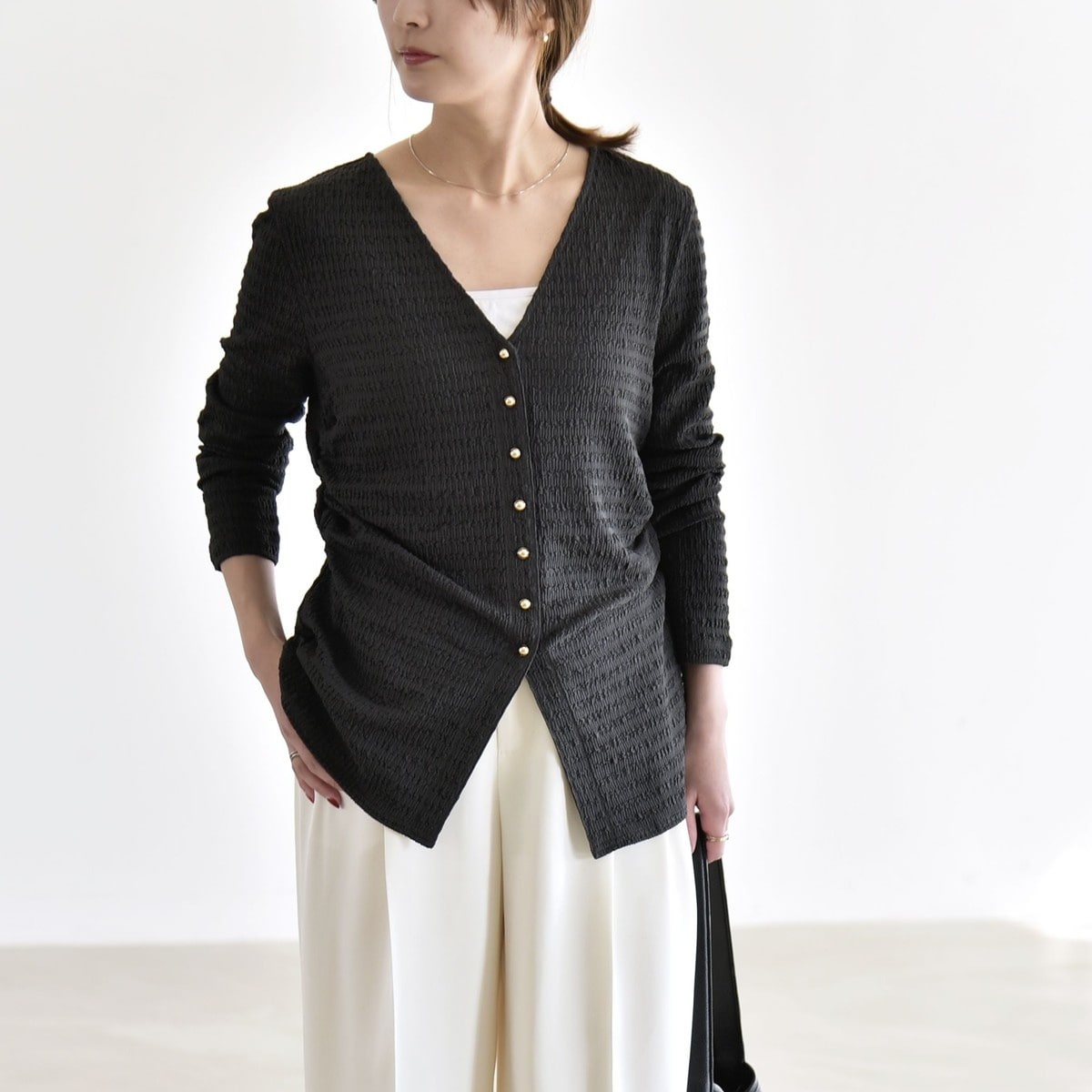 綺麗見えするので、オフだけでなく通勤やオフィスカジュアルなど幅広いシーンで活躍します。